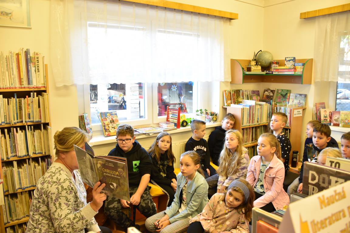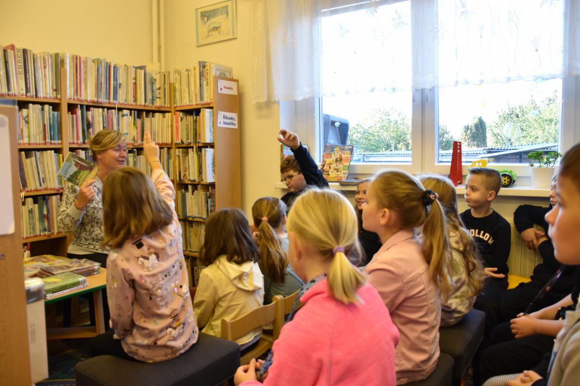 S dětmi jsme si povídali o zajímavých knížkách, z některých jsme si také četli. Byl to jeden z příběhů jezevce Chrujdy, pak to byla knížka M. Fišarové Kamínek a také strašný Gruffalo. Mezitím jsme si povídali o tom, jak se stát čtenářem knihovny a připomněli jsme si, jak to v knihovně funguje.