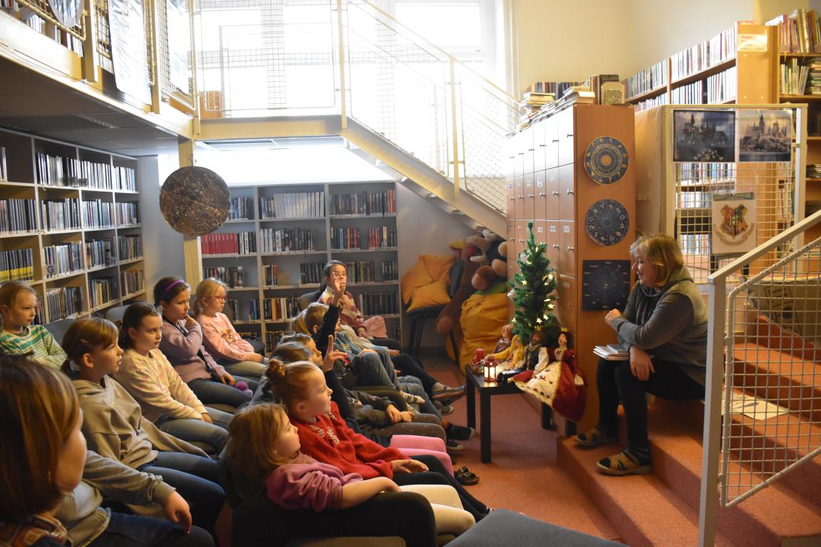 Povídali jsme si o symbolech Vánoc, o stromečku, o slunovratu, o pohádkách a dárkonoších z celého světa. Na závěr jsme si přečetli pohádku O bílém medvědu a pak se děti mohly porozhlédnout po knihovně a vybrat si různé autorské omalovániky, vystřihovánky a pexesa.